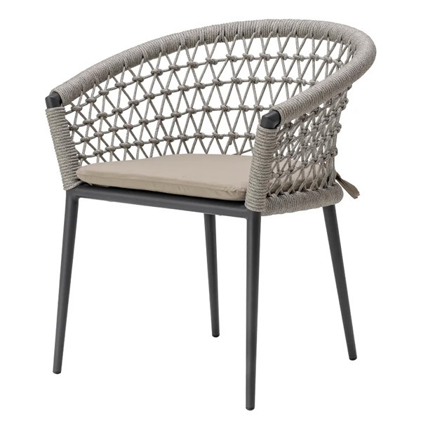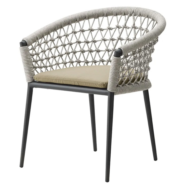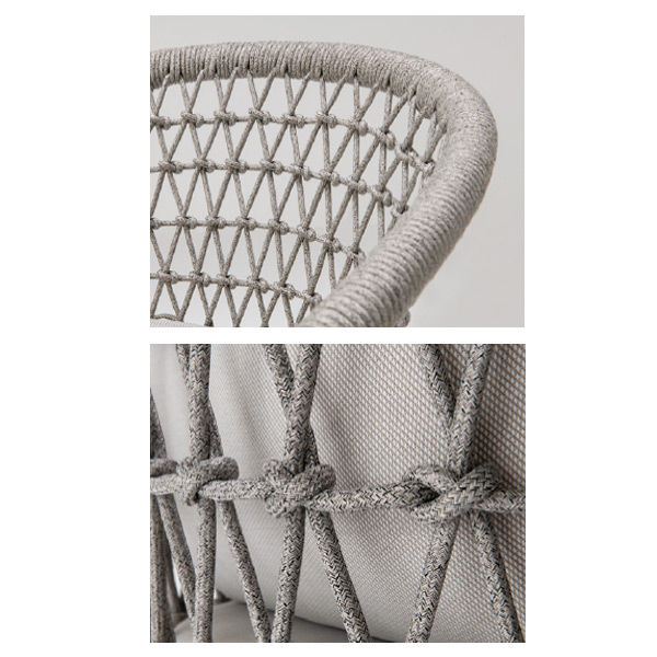 ロープ編みデザインとアルミフレームを組み合わせた屋外対応家具「Muses」。チェア・1人掛・2人掛ソファまで揃い、撥水性クッションと高耐久アルミでテラスやラウンジに上質な雰囲気をプラス。