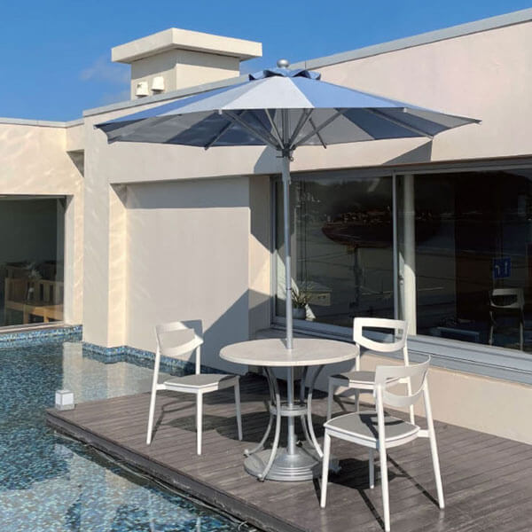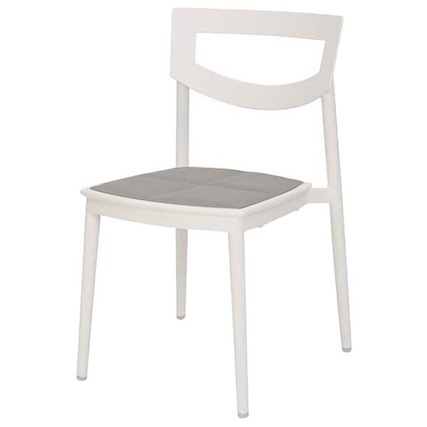 座面に透水性スポンジが入った、座り心地の良いアルミチェア。雨ざらしの屋外でも使用できます。