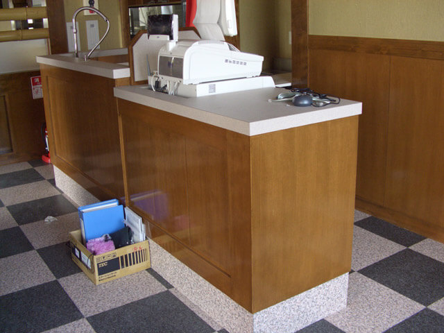 こちらはイス以外は全てオーダーでレジカウンターやベンチシート・テーブル・家具は全て特注です。