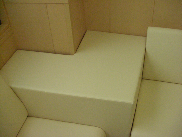 ソファの張生地はオールマイティの合皮レザーで、中央のソファと壁際のソファはひじを付けました。