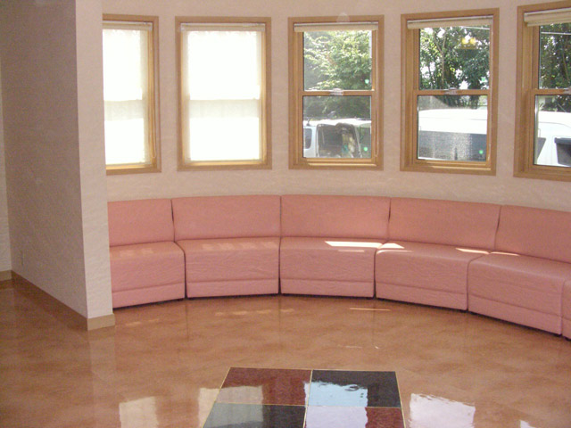 待合用のソファをコーナーにあわせて製作、納品しました。同じカラーのベンチも一緒に納めました。