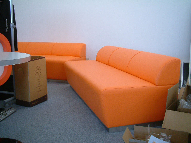 auショップにぴったりのオレンジ色の丸いソファがかわいらしいです。
