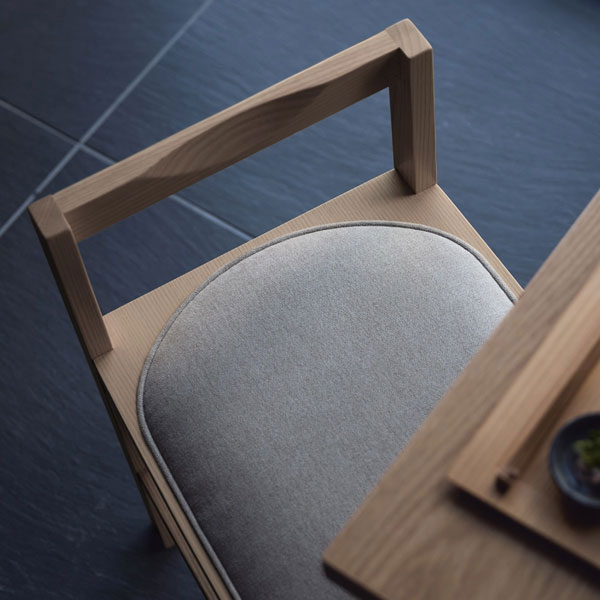 オーク材のフレームが美しい和風テイストな木製椅子です。省スペースに役立つ風通しの良いデザインです。カウンターチェアタイプもあります。
