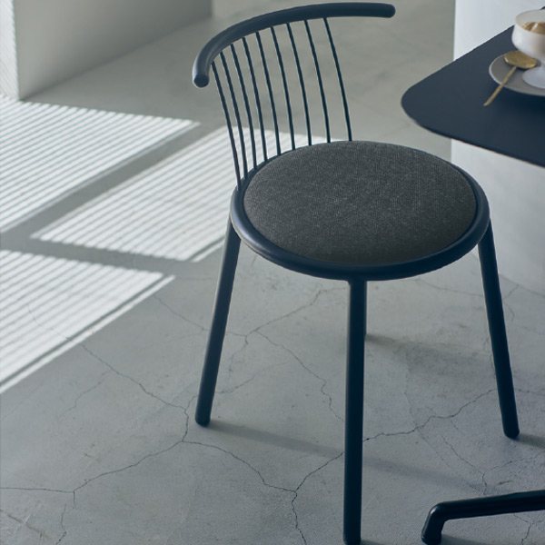 細いスチールの背もたれがまるで月明かりのように美しく、洗練された印象を与えるデザイン。モダン・ミニマルな空間にフィットします。