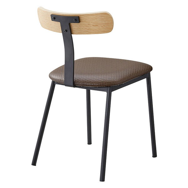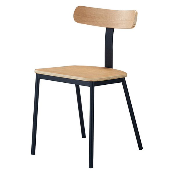 オーク合板の背とスチールの組み合わせが軽やかな雰囲気のチェア。板座タイプと張座タイプのネバダクロスがあります。