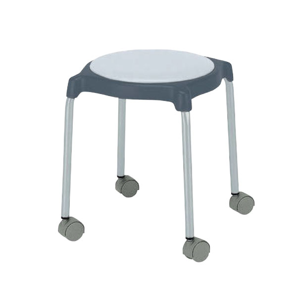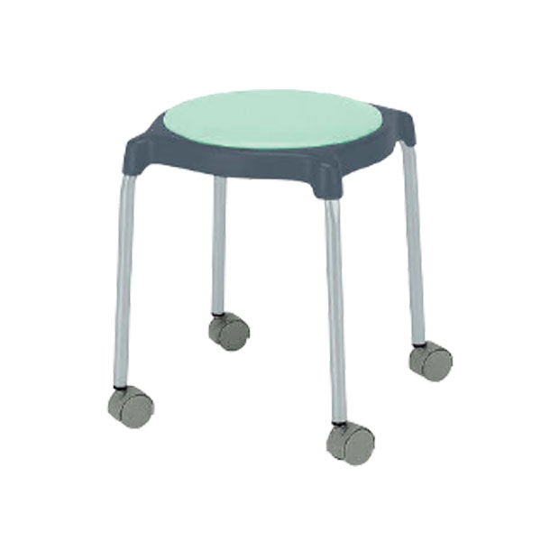 スタッキング可能な背なしキャスター脚のスチールパイプスツール。張地カラーは4色から選べます。