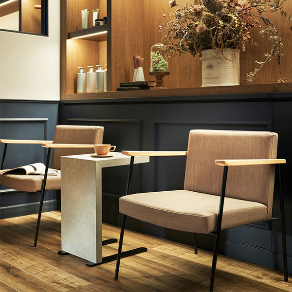 ほどよいボリュームと素材感は、サロンスペースなどに最適。肘部はオーク無垢材または、ウォールナット無垢材からお選びいただけます。