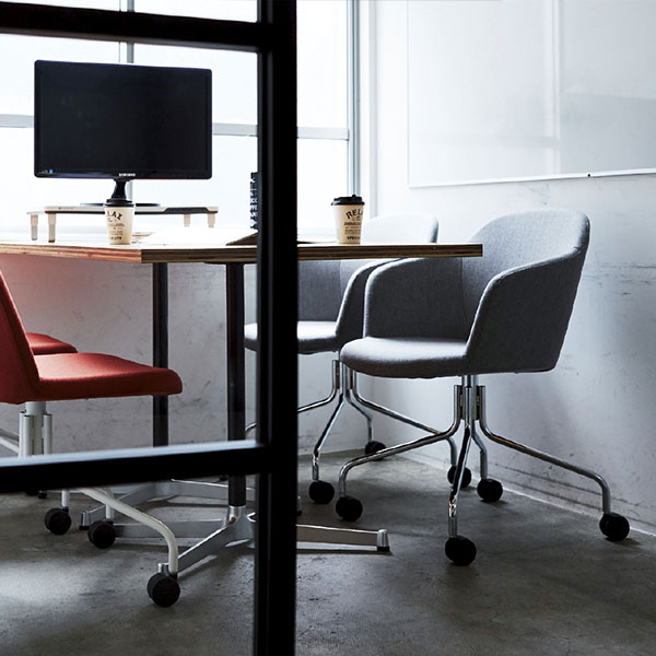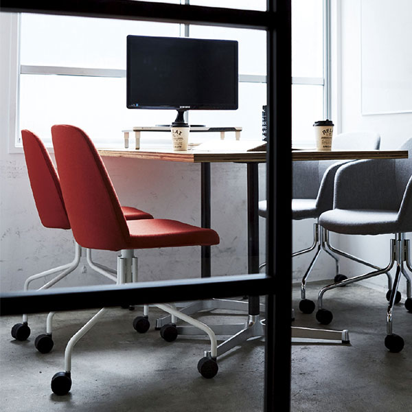 肘無しと肘付きの2タイプから選べる回転式のキャスター脚スチールチェア。オフィスや商業施設などに活躍します。