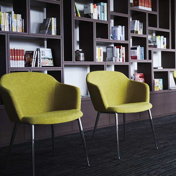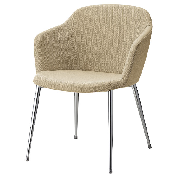ふくらみを持たせたフレンドリーなデザインに、テーパーパイプをシンプルに合わせた肘付きチェア。脚部は粉体塗装とクロームメッキ、特殊塗装から選べます。