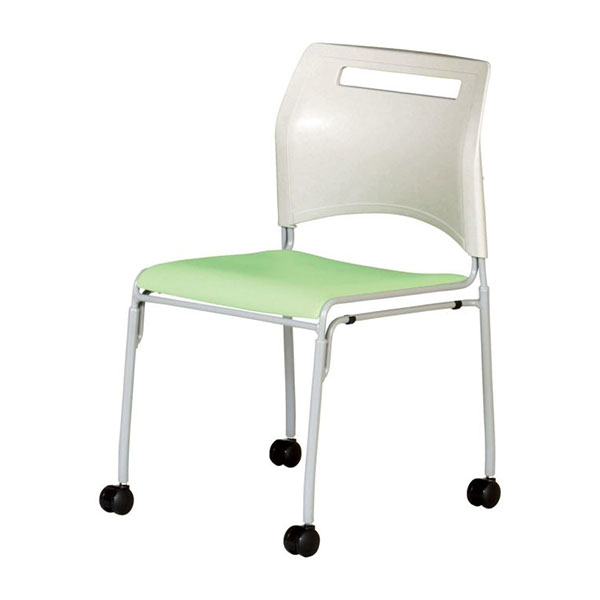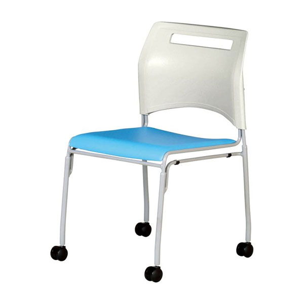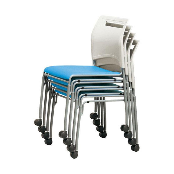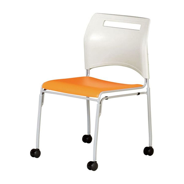 フードコートやカフェ、食堂、ミーティングルームにご使用いただけるキャスター付きスチールチェア。4脚までスタッキング可能です。
