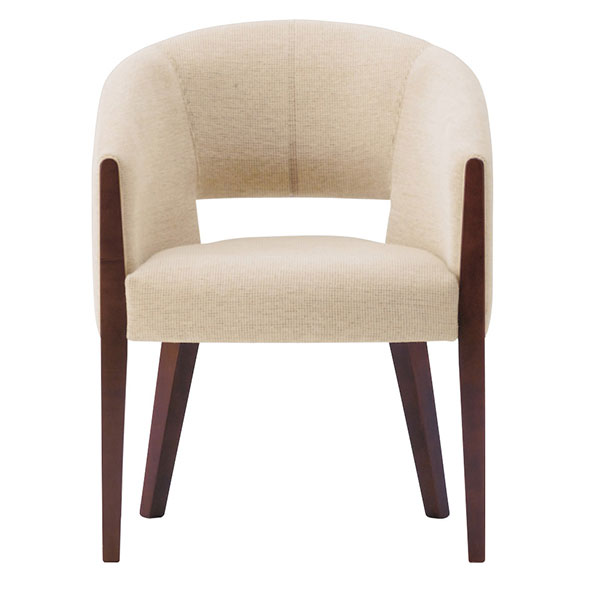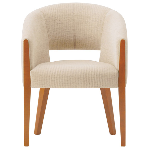 体を包み込む馬蹄型フォルム。ボリュームのあるチェアの背部を開口させ軽快さを表現しています。