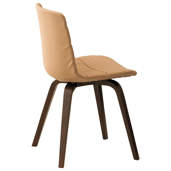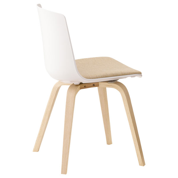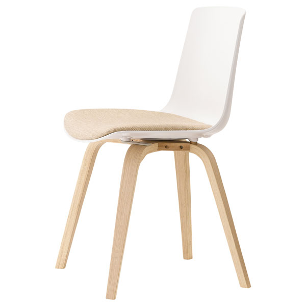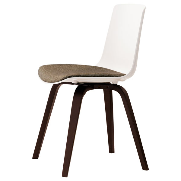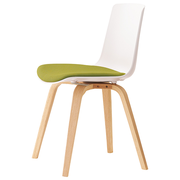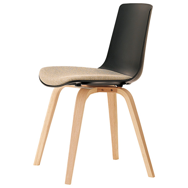 クナAは、樹脂のシェルと木製脚の組み合わせによる、素材のコントラストが特徴です。空間に心地よい緊張感を与えます。