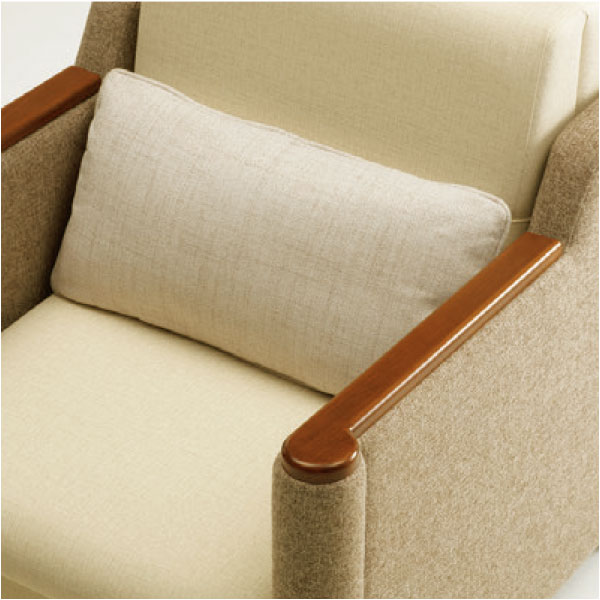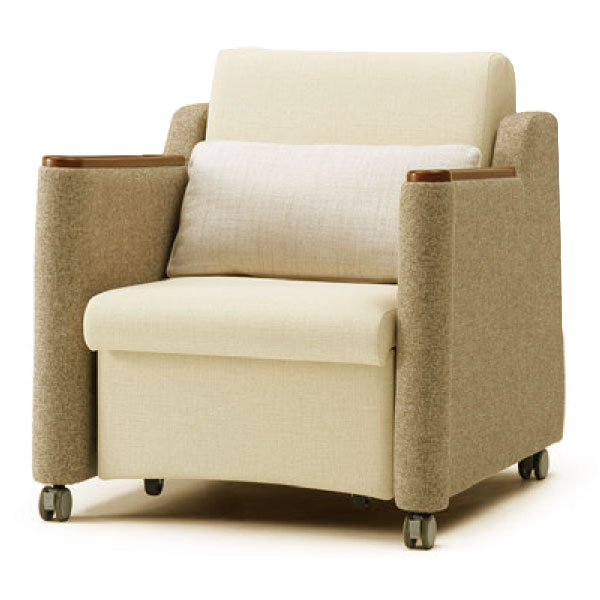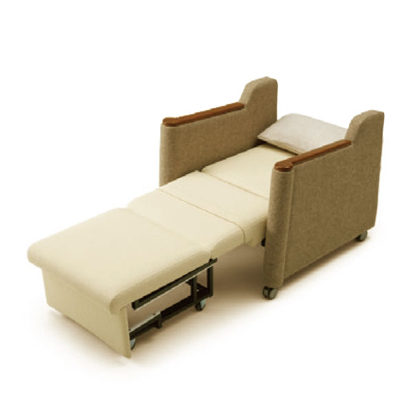 病院の特別室で患者さんが寛ぐイスとして、また付き添いをされる方のためのベッドに早変わりするチェアです。かんたん操作で、スムーズにベッドに変わります。