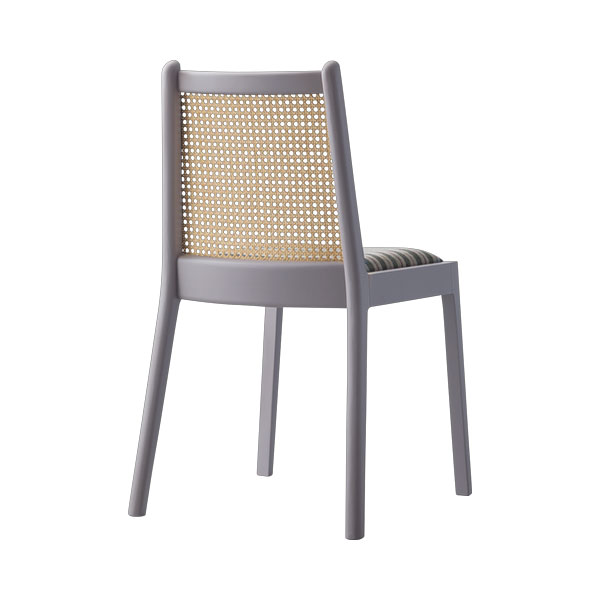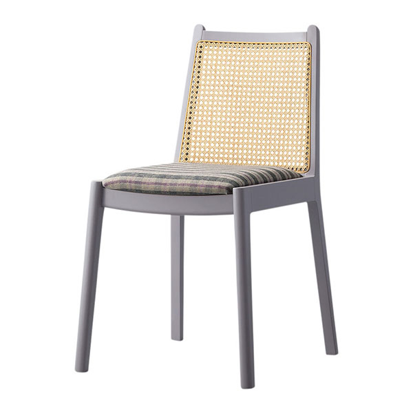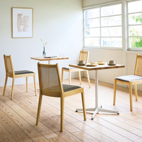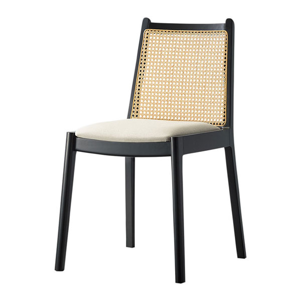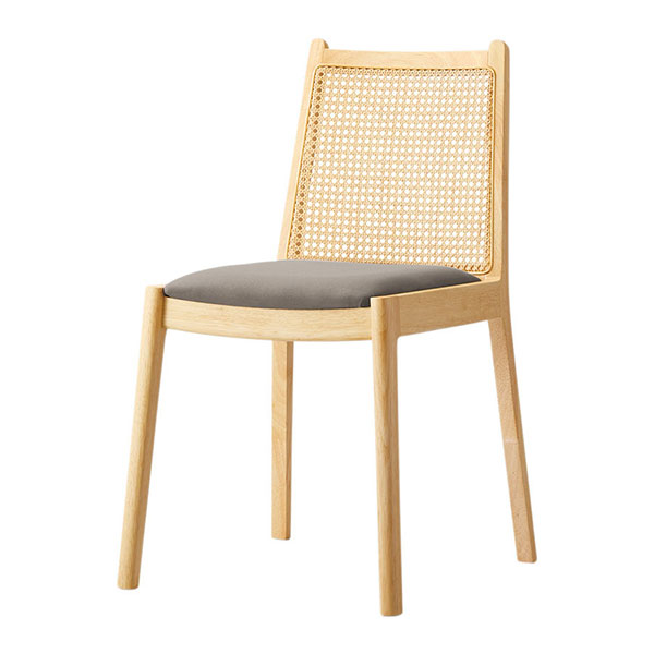 細部に丸みを付けることで、優しい印象に仕上げた木製チェア。背面のラタン素材と調和し、カジュアルなデザインに。