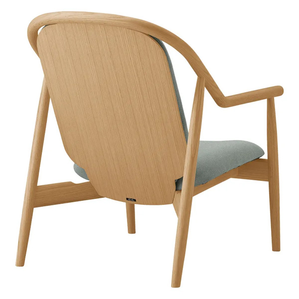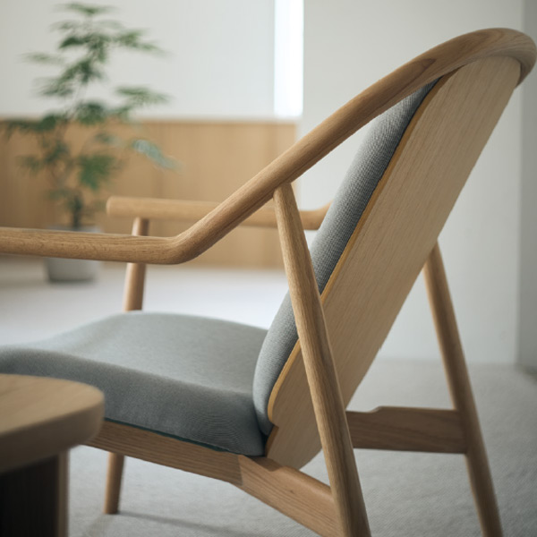 後ろ姿まで美しく、背板の滑らかなカーブと一体型の背座構造が印象的。空間の中央に置いても映える意匠性の高いモデル。