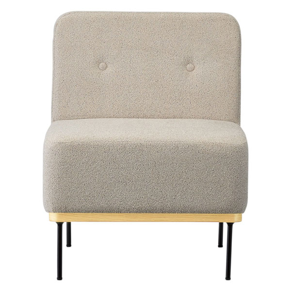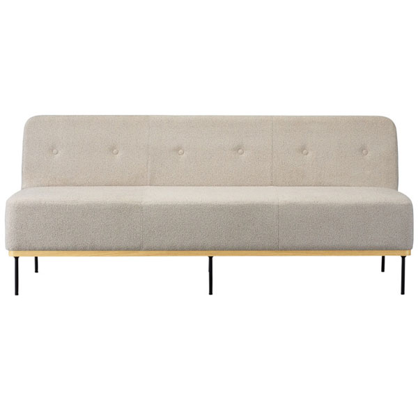 丸みを帯びたシルエットに、ボタン締め装飾がアクセント。カジュアルな空間に映える木金混合タイプのソファです。