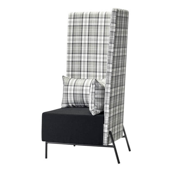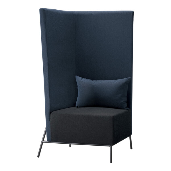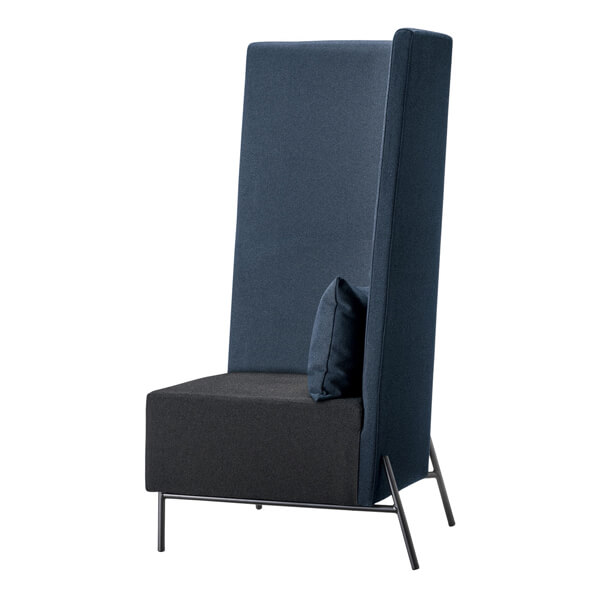 ハイバックが印象的な1人用のオフィスソファ。並べることで2人用ソファとしても使用可能。少し外に広がったハイバックの背と、それを支える脚が印象的です。