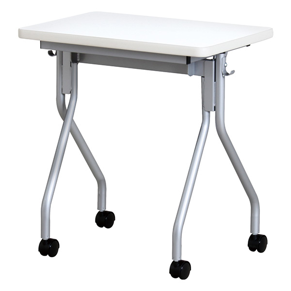 天板跳ね上げによる平行スタッキングが可能で、棚やフックも付いた、便利な研修用テーブルです。
