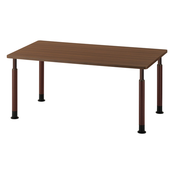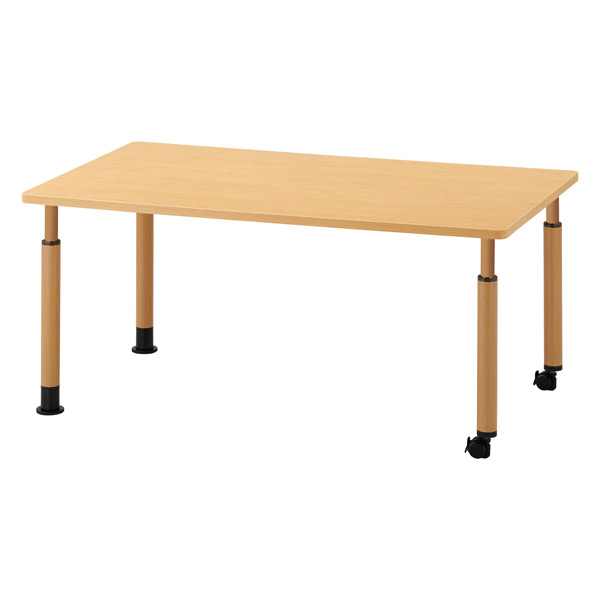木目シート仕上げの昇降脚付スチールポール脚。利用者に合わせて、きめ細やかな高さ調整ができます。テーブル天板は抗菌機能付きで衛生面でも安心です。