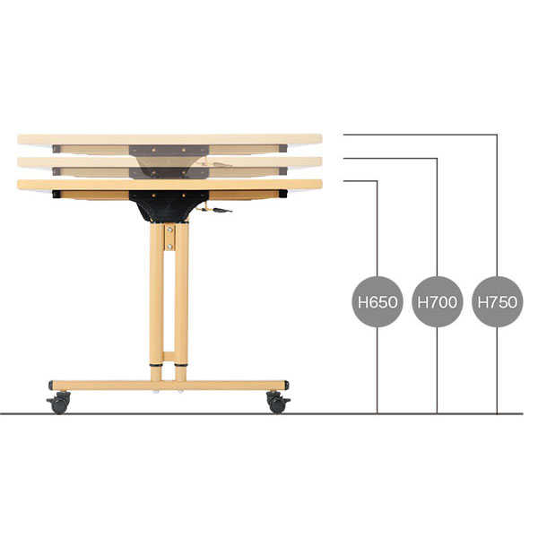 天板を最上段まで上げるとロックが解除し、ゆっくり天板が下がります。一番下まで下げると、カチッと音がしてロックが掛かりますので再度お好みの段数まで上げてください。