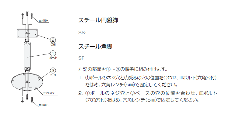 | ベース:スチール・アジャスター付 ポール:スチール丸パイプ(63.5φ) カラー:粉体塗装シルバー |
