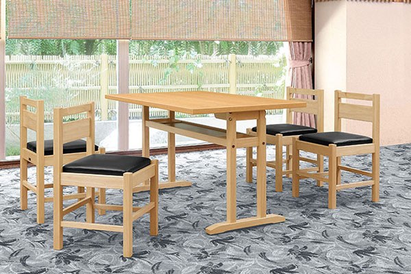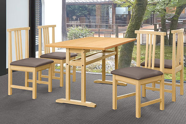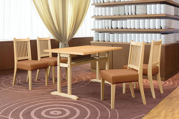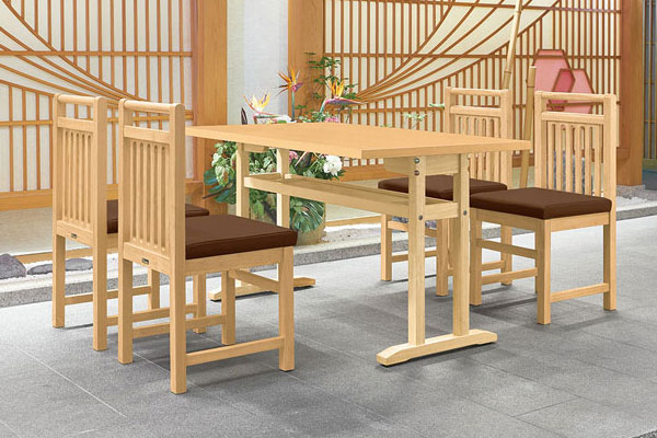 衛生的な抗菌仕様の和風テーブルです。狭い場所でも離着席がしやすい対立脚仕様で、手荷物置きになる棚付きです。エッジは共貼り仕上げです。